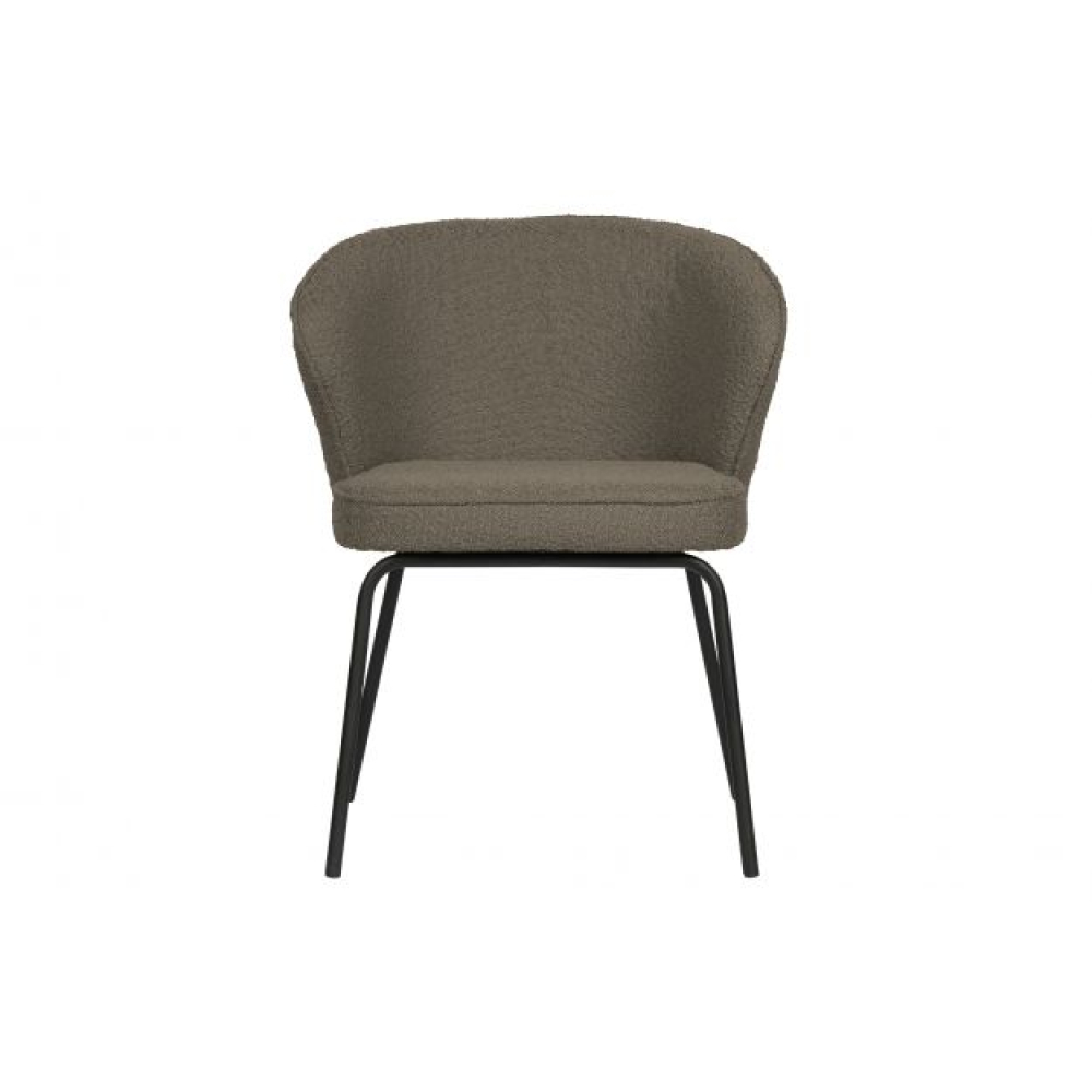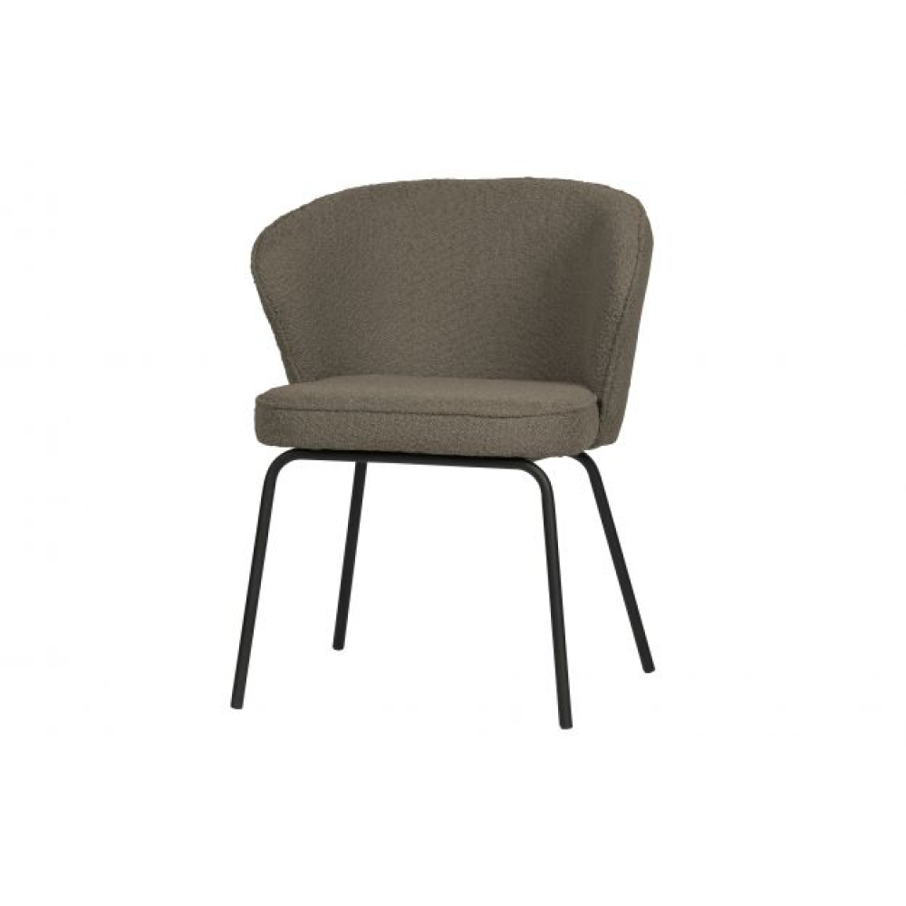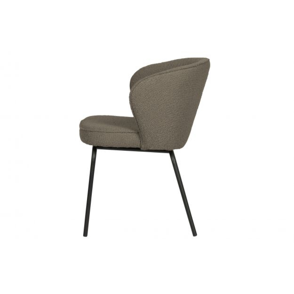 De ronde vormen maken dat de stoel vriendelijk oogt en al snel in het interieur past. Het zitgedeelte is gestoffeerd met een bouclé stof (100% polyester) met een Martindale van 100.000 in de neutrale kleur nougat. Het onderstel is gemaakt van metaal en heeft een mat zwarte poedercoating.