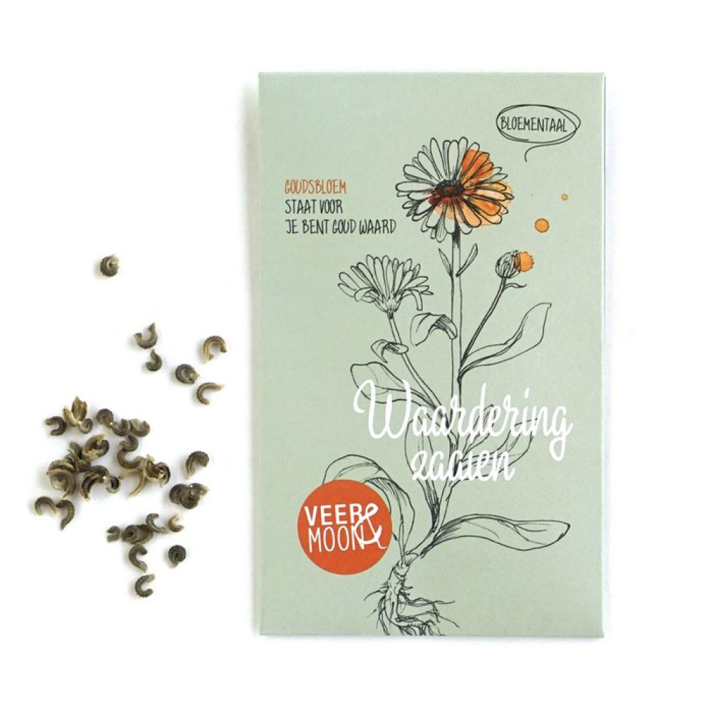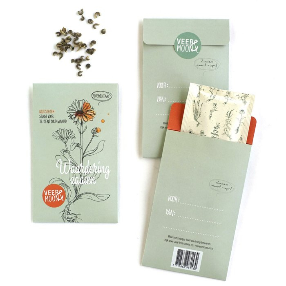 Zadenzakje 'Waardering', oranje goudsbloem zaden, met de mogelijkheid om achterop de verpakking de naam van de zender en ontvanger te zetten. Leuk om te versturen.