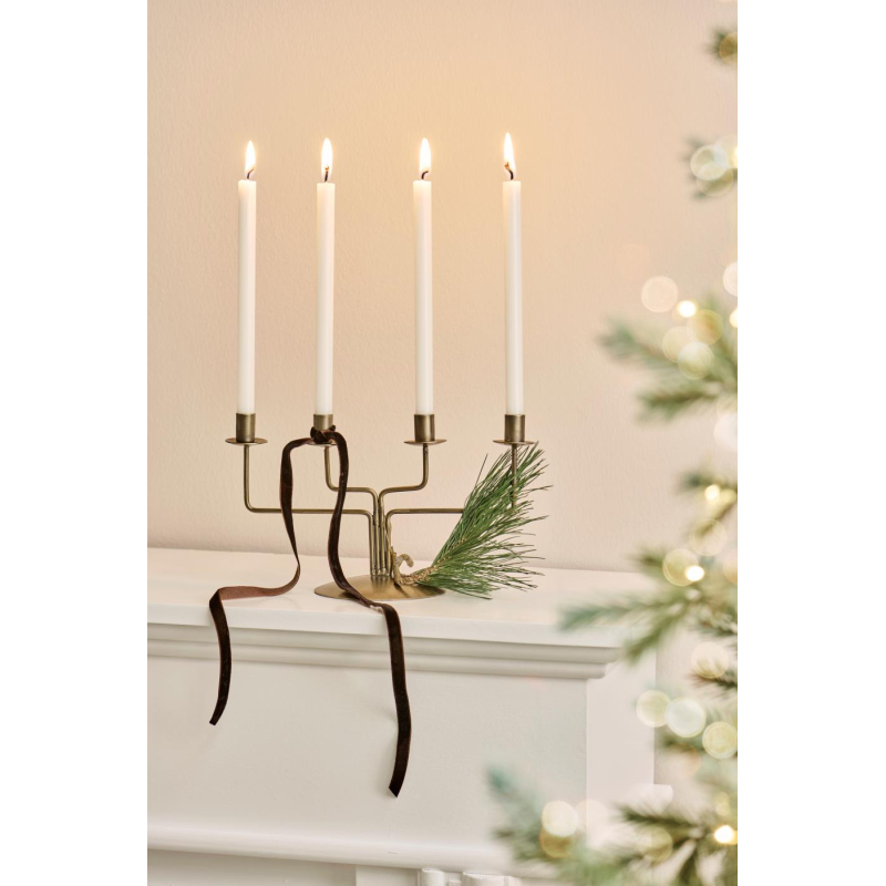 Combineer meerdere conische kaarsen van verschillende hoogtes op een houten plank of metalen schaal voor een sfeervol tafereel. Voeg wat dennenappels, kerstgroen of een linnen tafelloper toe om een warme en feestelijke ambiance te creëren.