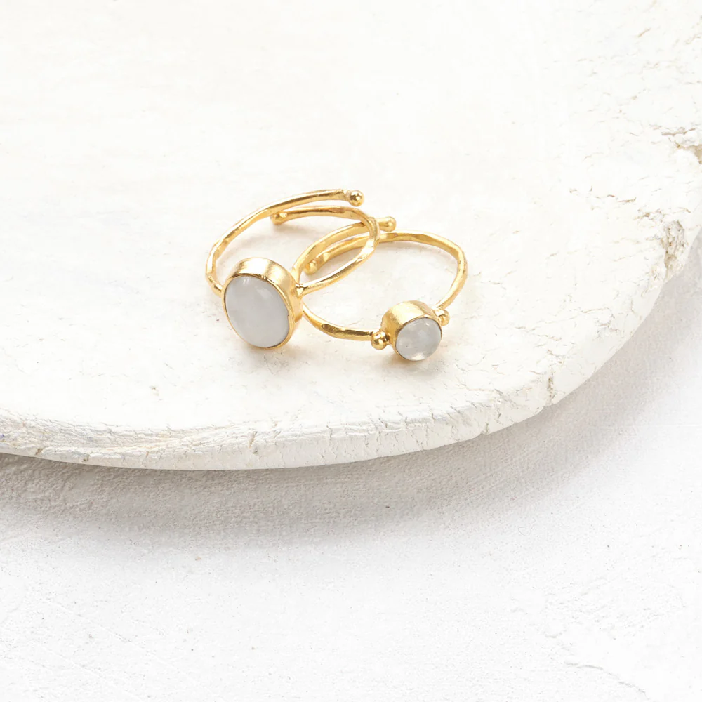 Breng zachtheid en mystiek in je stijl met de Faithful Maansteen Vergulde Ring van A Beautiful Story. Deze ring is handgemaakt in Nepal door lokale vakmensen en combineert de warme glans van verguld met de zachte, iriserende tinten van maansteen. De steen staat symbool voor intuïtie, vrouwelijke energie en balans, waardoor deze ring zowel stijlvol als betekenisvol is. Perfect als cadeau voor haar of om jezelf te verwennen.