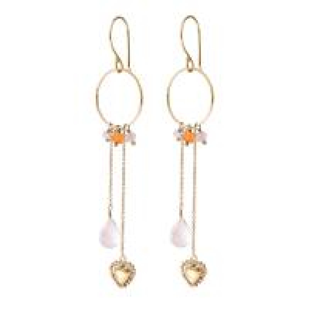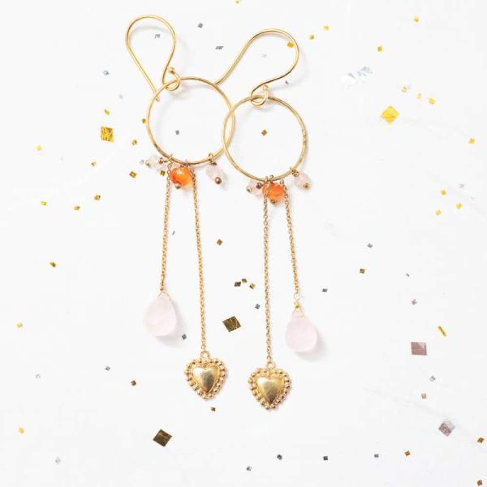 Deze gouden haakoorbellen hebben een ring met gefacetteerde rozenkwarts en carneool edelstenen, een ovale rozenkwarts edelsteen en een verguld/verzilverd messing hart symbool.