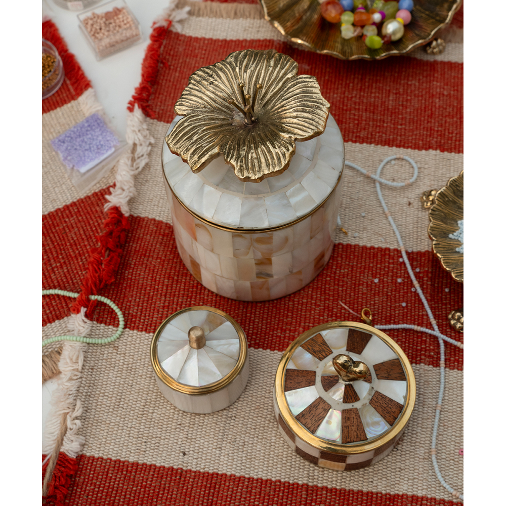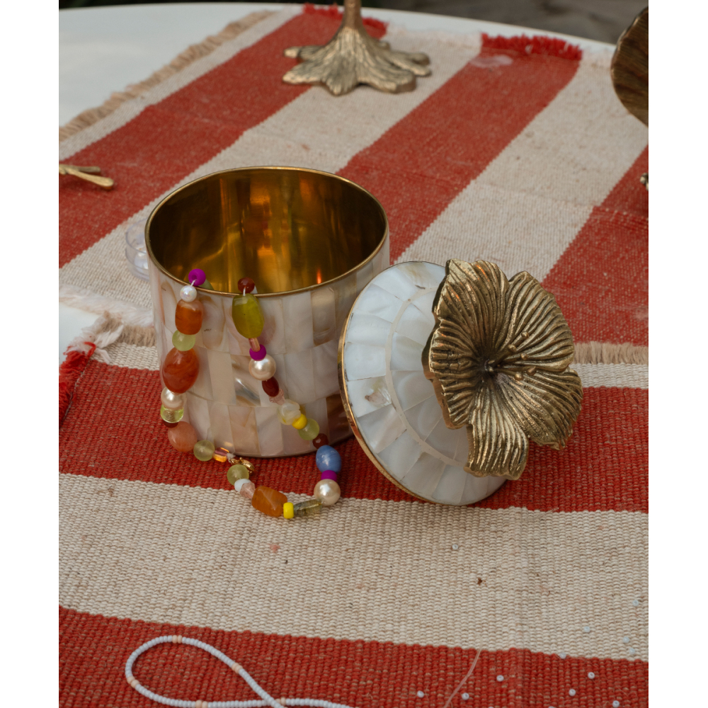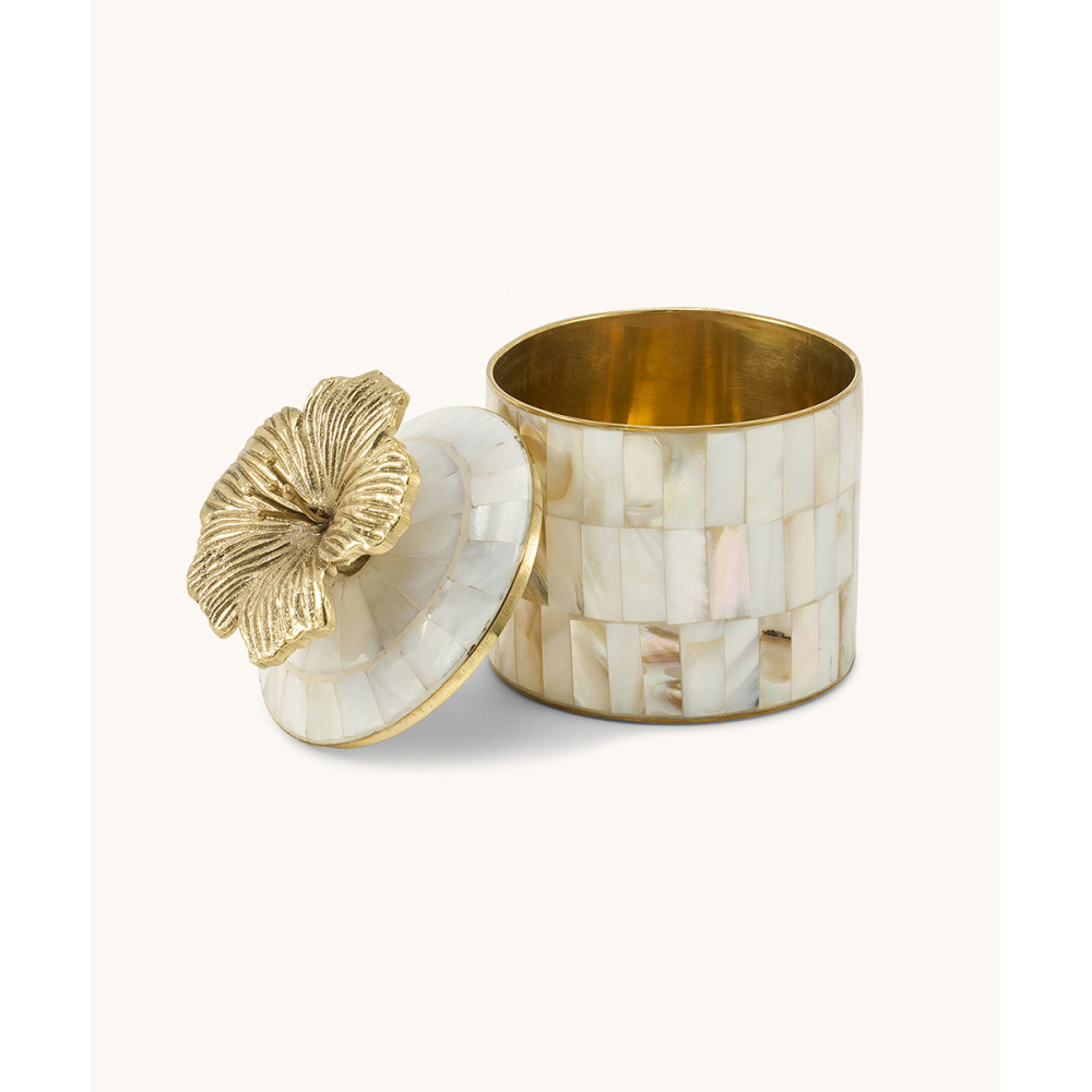 Bewaar je meest kostbare schatten in dit Hailey Hibiscus Circus Doosje. Deze doosjes van messing en schelp zijn handgemaakt