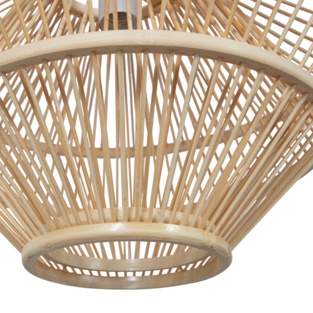 Door de open structuur van de kap verspreid de lamp een sfeervol licht en past hij in een natuurlijke en moderne interieurstijl.