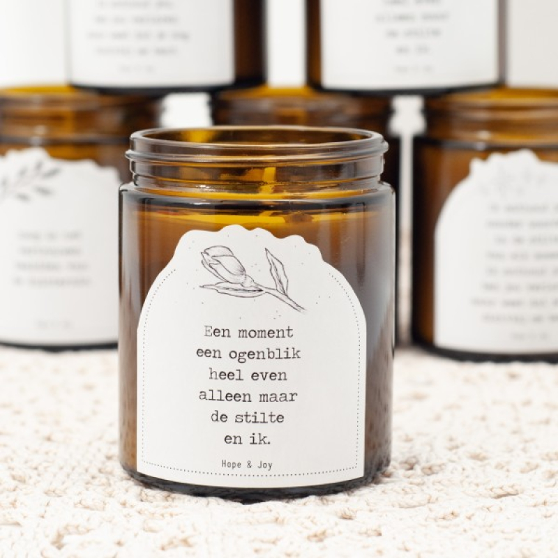 Soms zegt stilte meer dan duizend woorden… De “Moment Stilte” kaars van Hope & Joy brengt precies dat – rust, warmte en betekenis in één klein lichtpunt. Met haar verfijnde geur en stijlvolle uitstraling is deze kaars een subtiel eerbetoon aan de momenten die echt tellen.