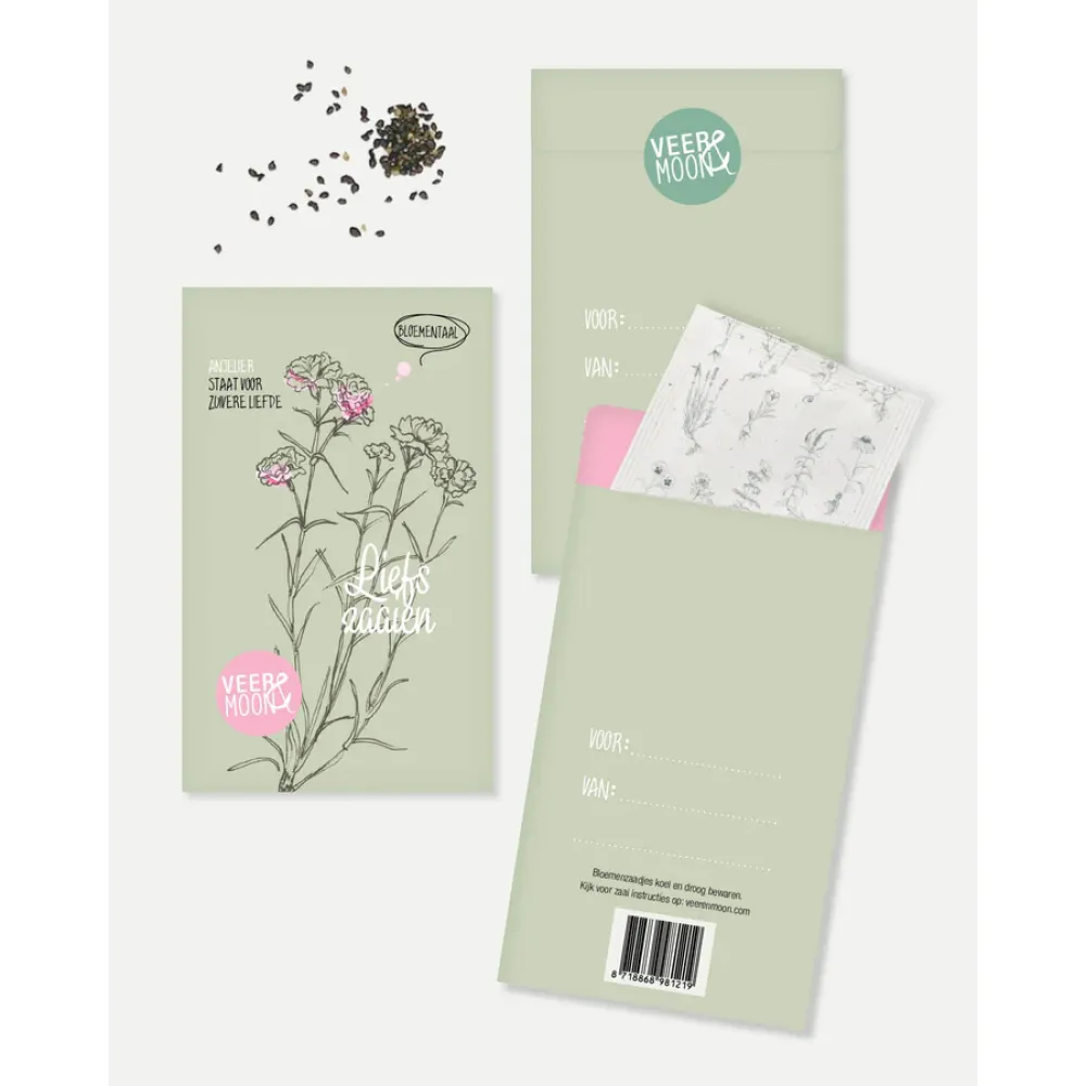 Zadenzakje 'Liefs zaaien' van Veer & Moon met anjelier zaden, met de mogelijkheid om achterop de verpakking de naam van de zender en ontvanger te zetten.