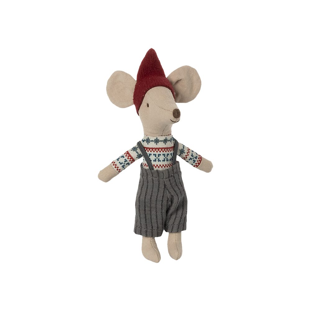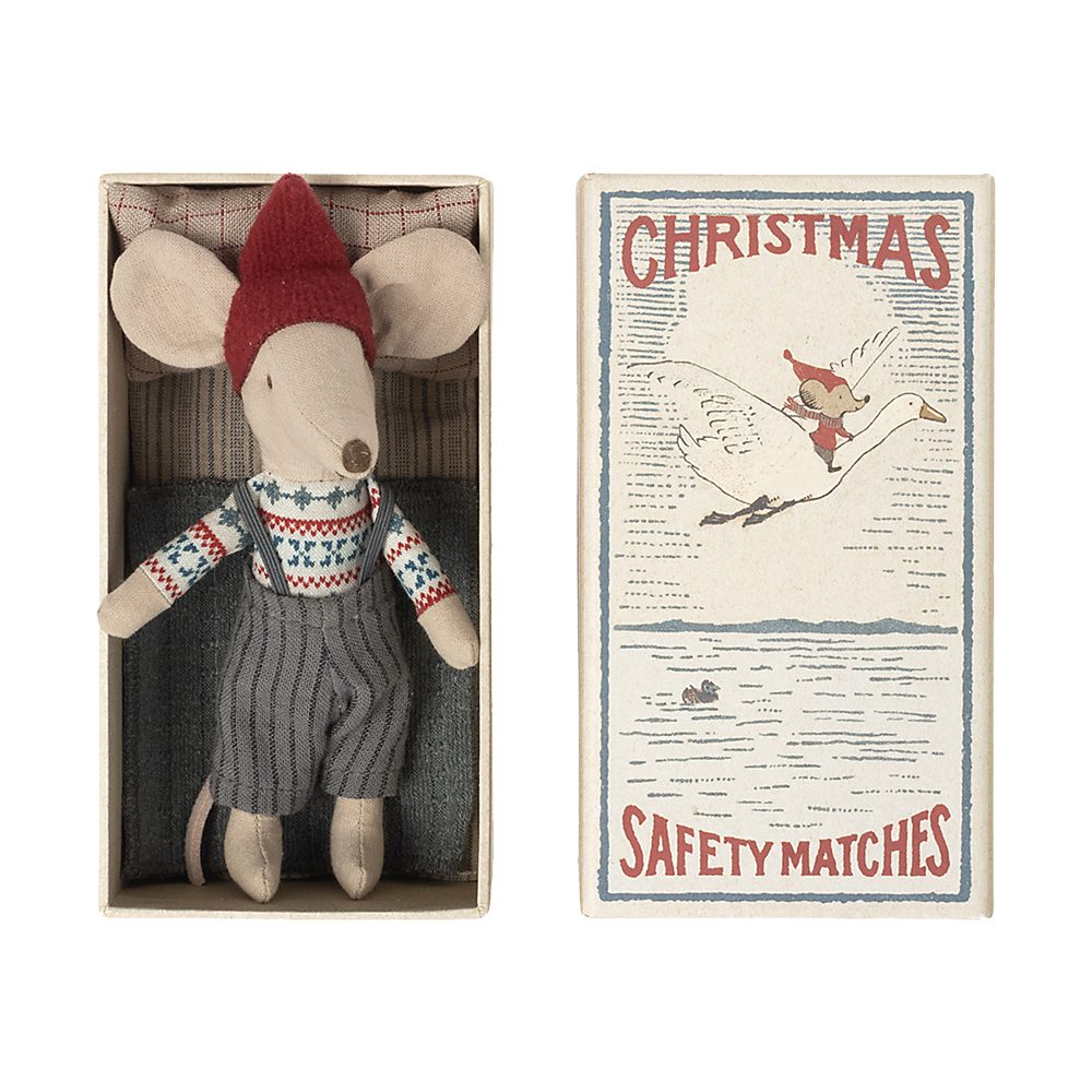 De kerstmuis zit in een mooi luciferdoosje, waarin hij slaapt tussen het zachtste bedlinnen. En het past perfect in het gemberkoekhuis van Maileg. Maak er een magische kerst van!