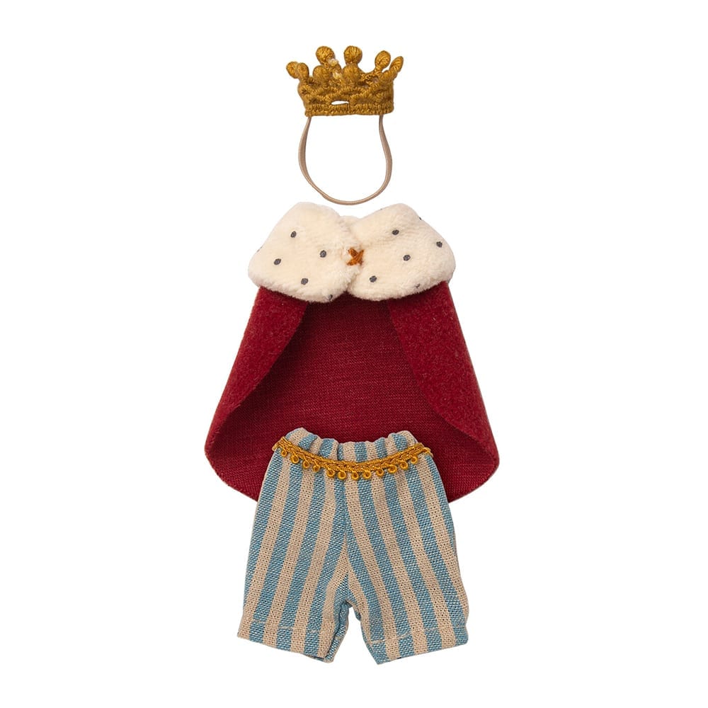 Wat dacht je van zijne majesteit Koning Muis. De koning draagt een prachtige mantel en een kroon.