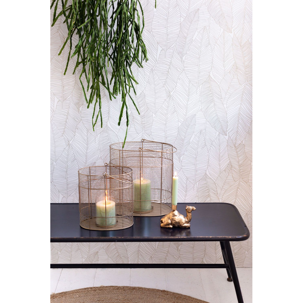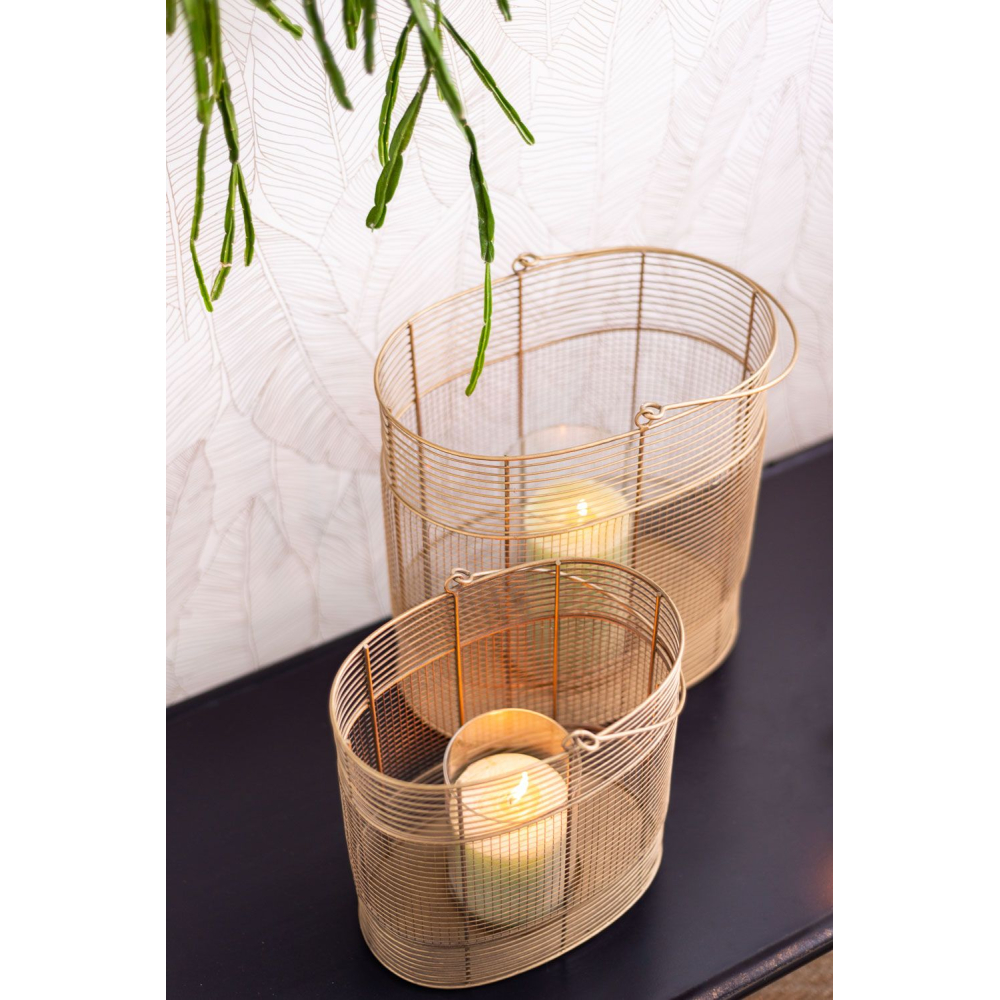 Mooie ovale lantaarn in een matte brass look met handvat om evt op te hangen, incl glazen theelichthouder