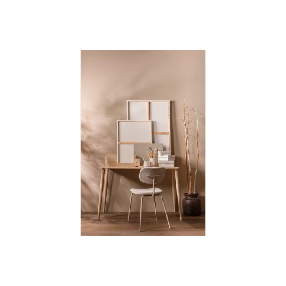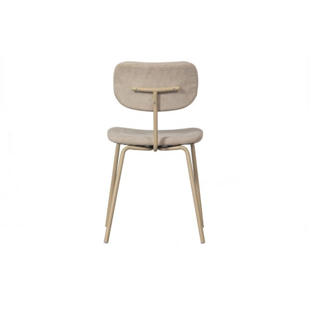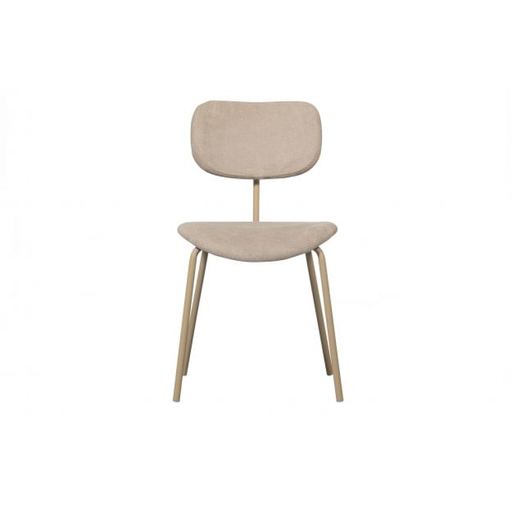 Stijlvol in zijn eenvoud, dat is deze eetkamerstoel. De eetkamerstoel heeft een slank metalen onderstel, gecoat in een zandkleur. De zitting is bekleed met een matglanzende, zachte ribstof met een opvallend kronkelend banenpatroon.