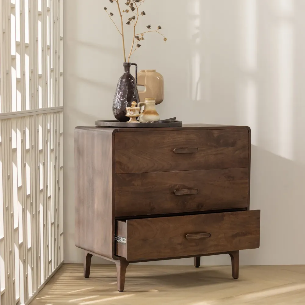 Plaats de Liya ladekast in de slaapkamer als stijlvolle opberger of gebruik hem in de woonkamer als dressoir. Combineer met zachte, lichte accessoires om contrast te creëren, of ga juist voor warme tinten zoals terracotta en goud om de diepe kleur te versterken. Een grote spiegel of kunstwerk boven de kast maakt het geheel compleet.
