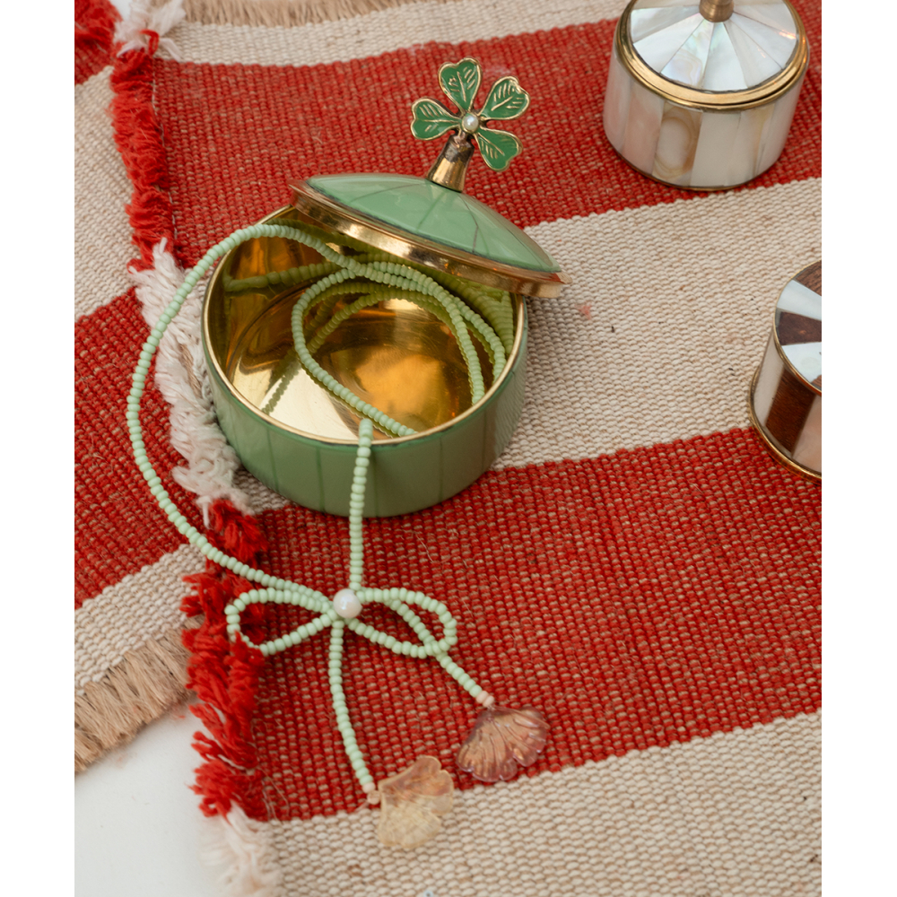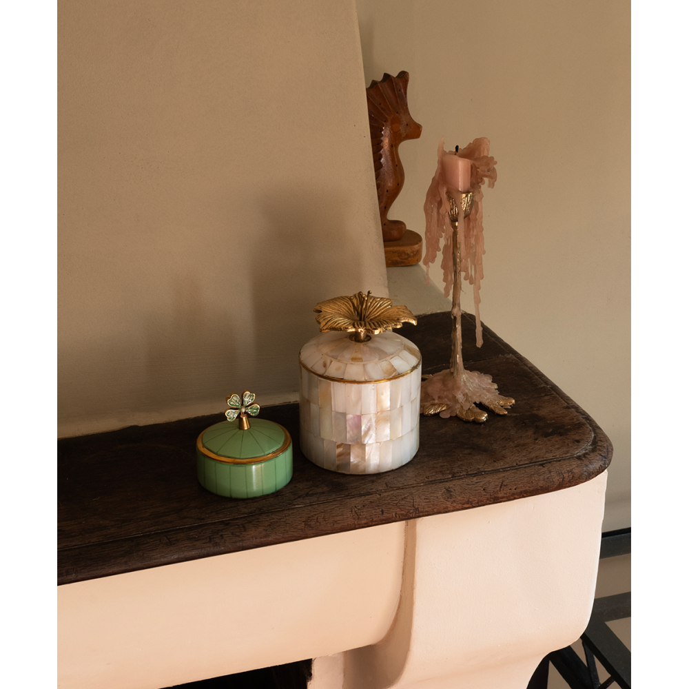 ambachtslieden in India! Dit speelse doosje bestaat uit messing en schelp en is perfect voor het opbergen van je kleine schatten