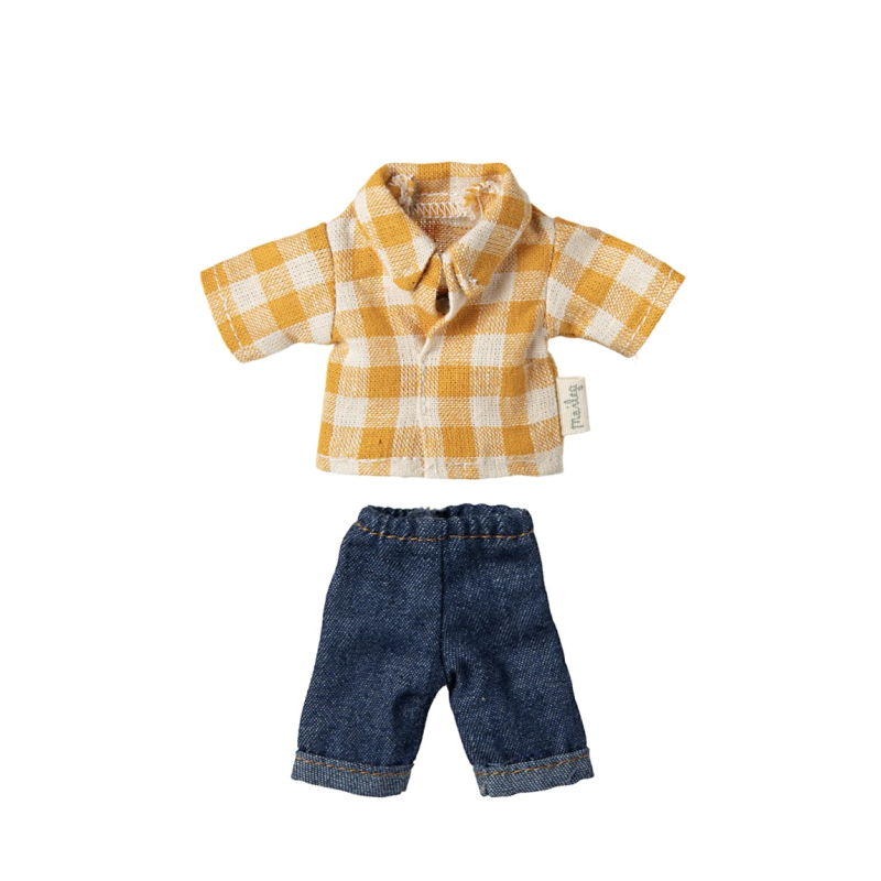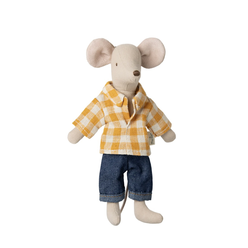 De knuffel heeft geborduurde oogjes en een spits snuitje. Vader knuffelmuis draagt een geel geruit blousje en een denim broek. De poppenoutfit van het muisje kun je aan- en uittrekken.