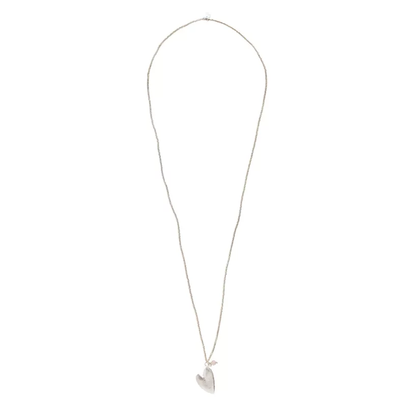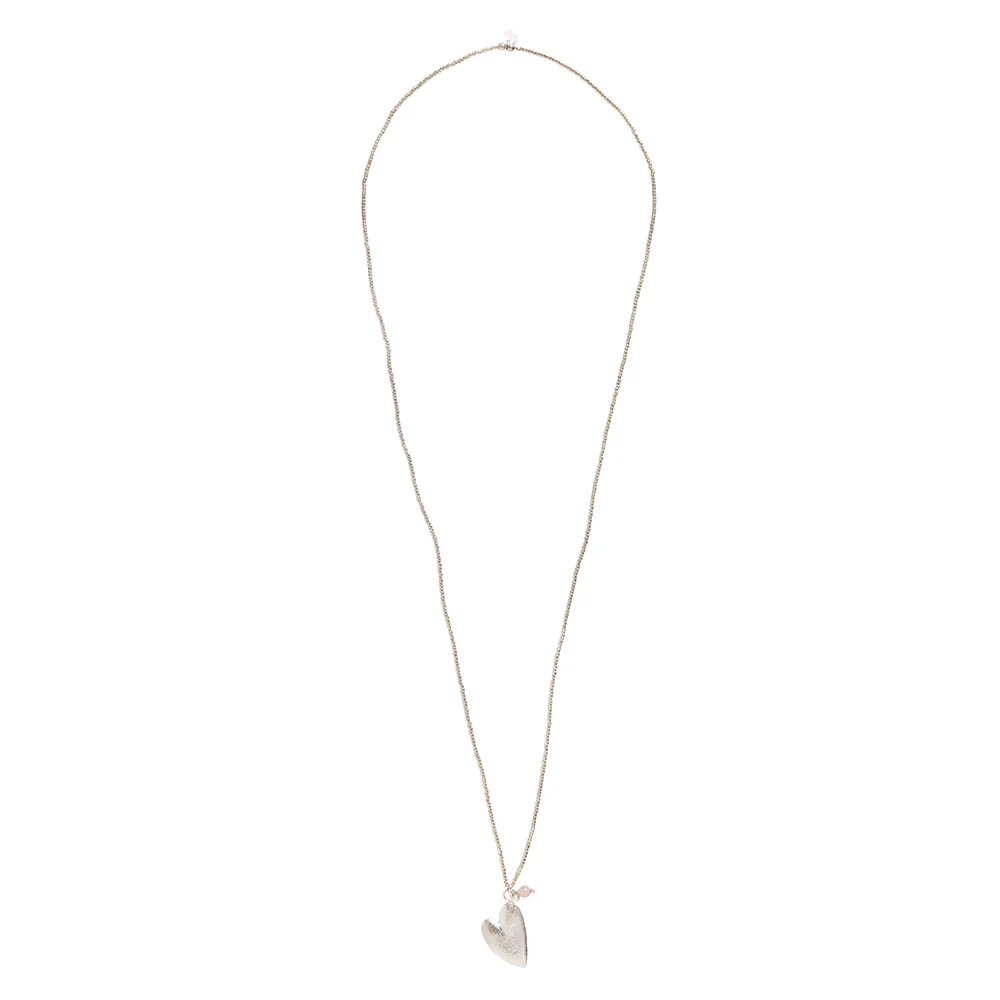 De ketting is gemaakt van gefaceteerde messing kralen, een zilverkleurig hart en een rozenkwarts edelsteen. De lengte van de ketting is 70 centimeter.