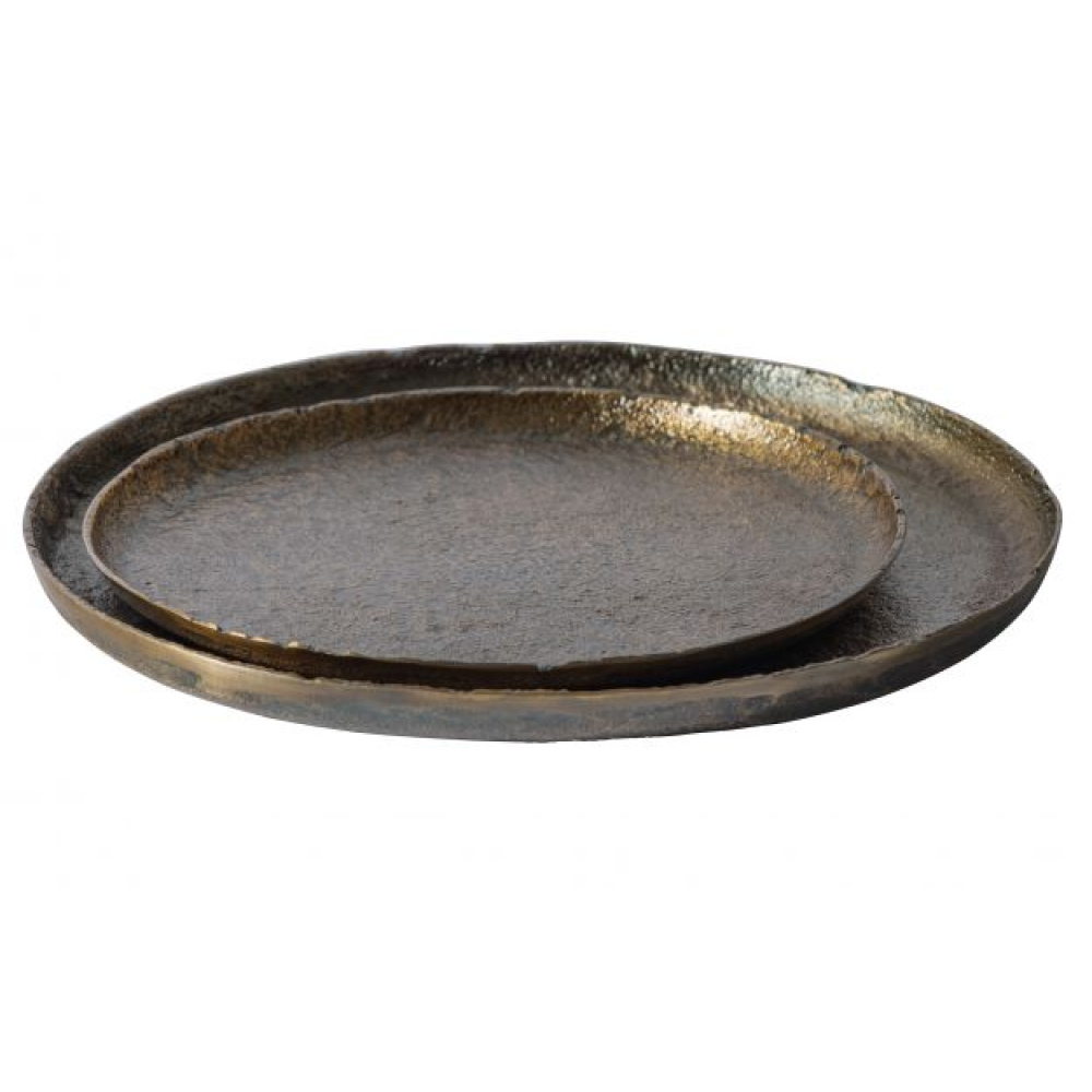 Deze set van twee schalen is een robuust duo met karakteristieke kenmerken. De Serving Plate set komt uit de collectie van het Nederlandse interieurmerk BePureHome en is gemaakt van sterk aluminium. De dienbladen hebben de natuurlijke kenmerken van het aluminium behouden, wat betekent dat butsen en krassen de schalen veel karakter geven. De antique brass coating geeft de Serving Plate set een luxe uitstraling.
