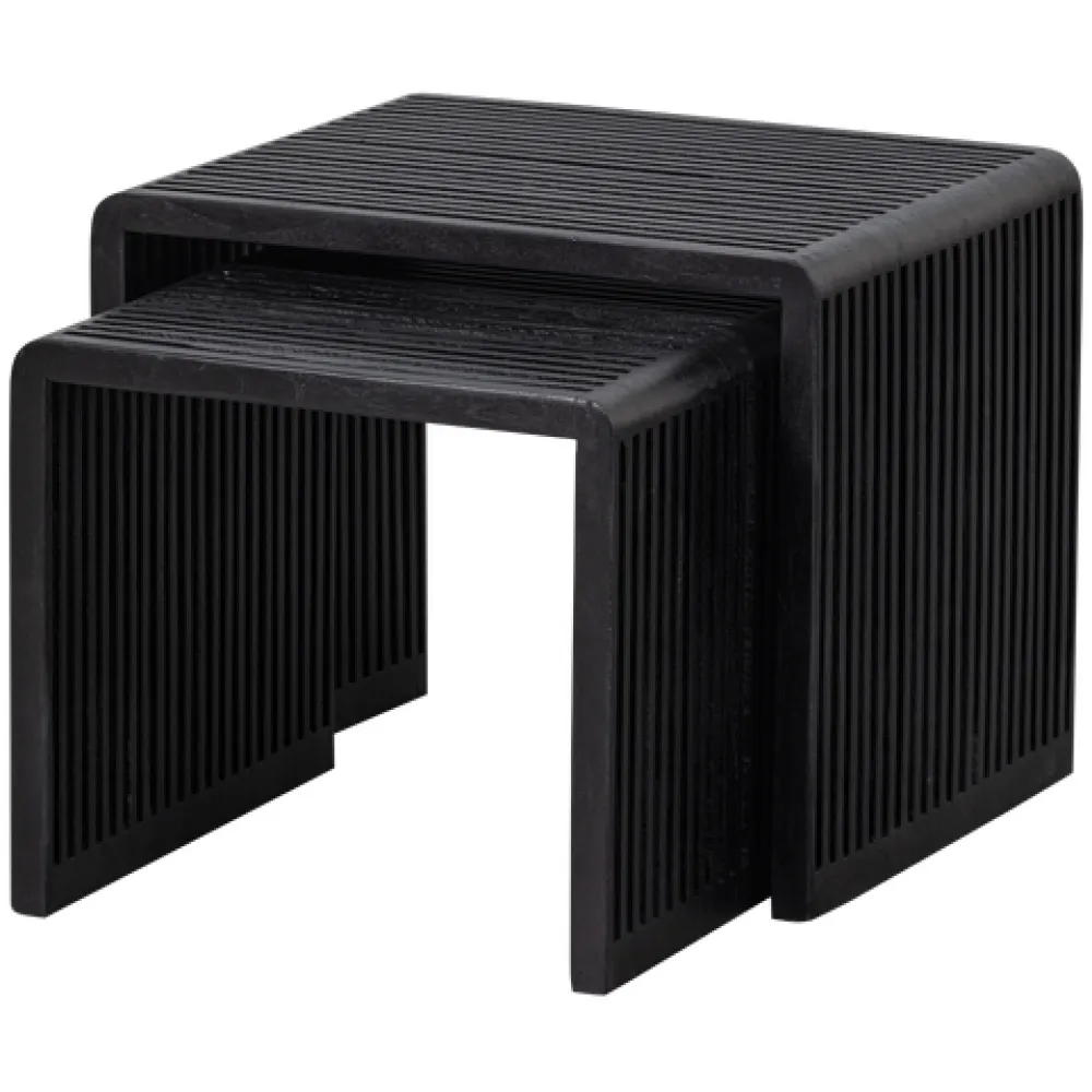 Deze organische set is vervaardigd uit een gerecycled teakhout. De matzwarte afwerking zorgt voor een rustige uitstraling, waardoor de tafels goed passen in een moderne of hotel chique woonstijl.