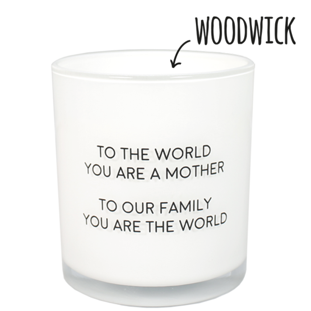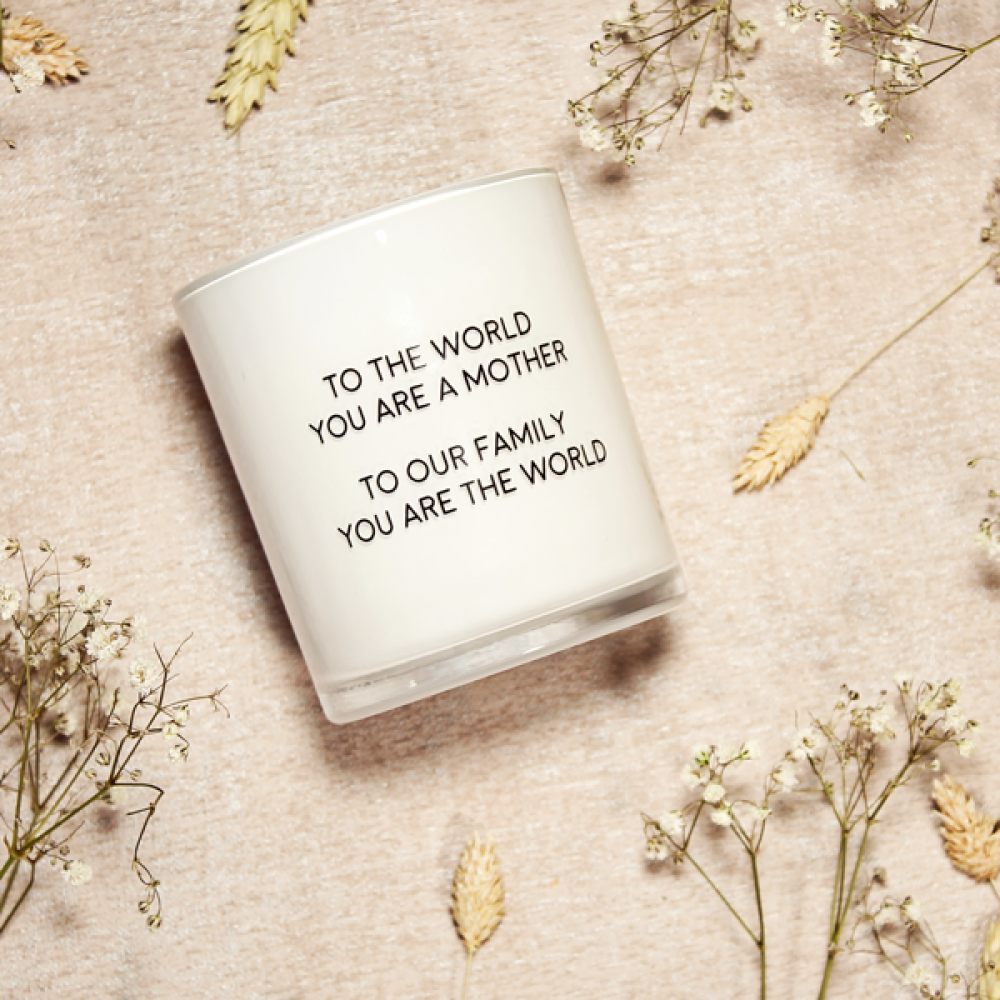 Een heerlijke geurkaars gemaakt van biologische sojawas. Deze kaars heeft de geur Fresh Cotton en brandt ca. 50 uur. Deze sojakaars wordt gesierd met de tekst 'To the world you are a mother. To our family you are the world'.