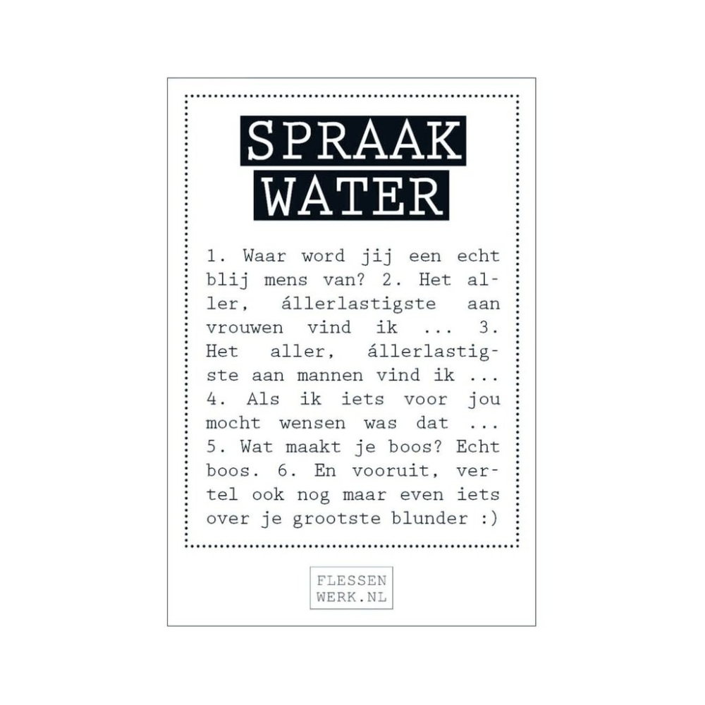 Een fles bronwater met vragen om een leuk, goed, of grappig gesprek op gang te helpen.