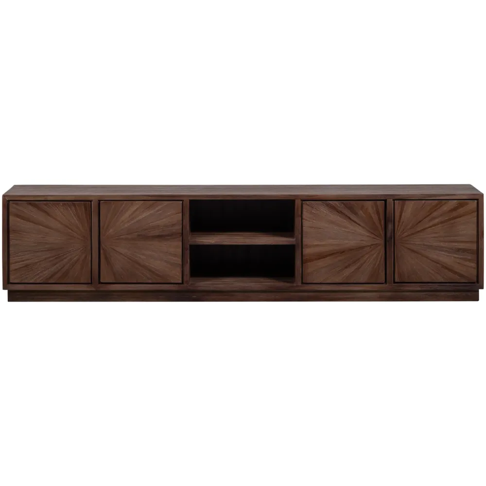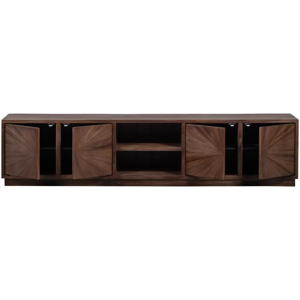 Plaats het Sun tv-meubel in combinatie met een groot vloerkleed en zachte texturen zoals linnen of wol om warmte toe te voegen. Gebruik het open vak voor een mooi tijdschriftenrek of een stapel koffietafelboeken, en werk af met een paar keramieken accessoires of een sfeervolle tafellamp. Zo maak je van je tv-hoek een stijlvolle eyecatcher.