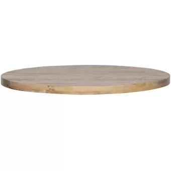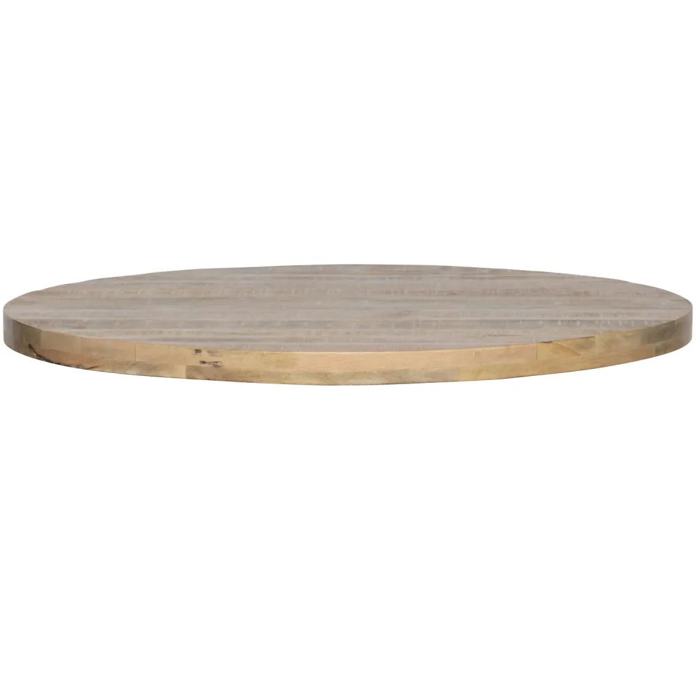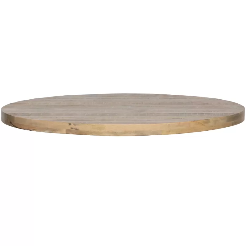 Dit mangohouten Tablo tafelblad heeft een grootte van Ø120 cm, zodat je er gemakkelijk met 4-5 personen aan kunt zitten. Het blad is 5,5 cm dik. Het tafelblad beschikt over een opdikrand rondom. Het mango hout is afgewerkt met een lime wash finish, waardoor het mango hout een soort white wash laagje krijgt. Deze afwerking verbeterd de algehele uitstraling van het hout en benadrukt tegelijkertijd de schoonheid van de houtnerf. Het tafelblad heeft hierdoor een stoer en robuust uiterlijk met een lichte uitstraling.
