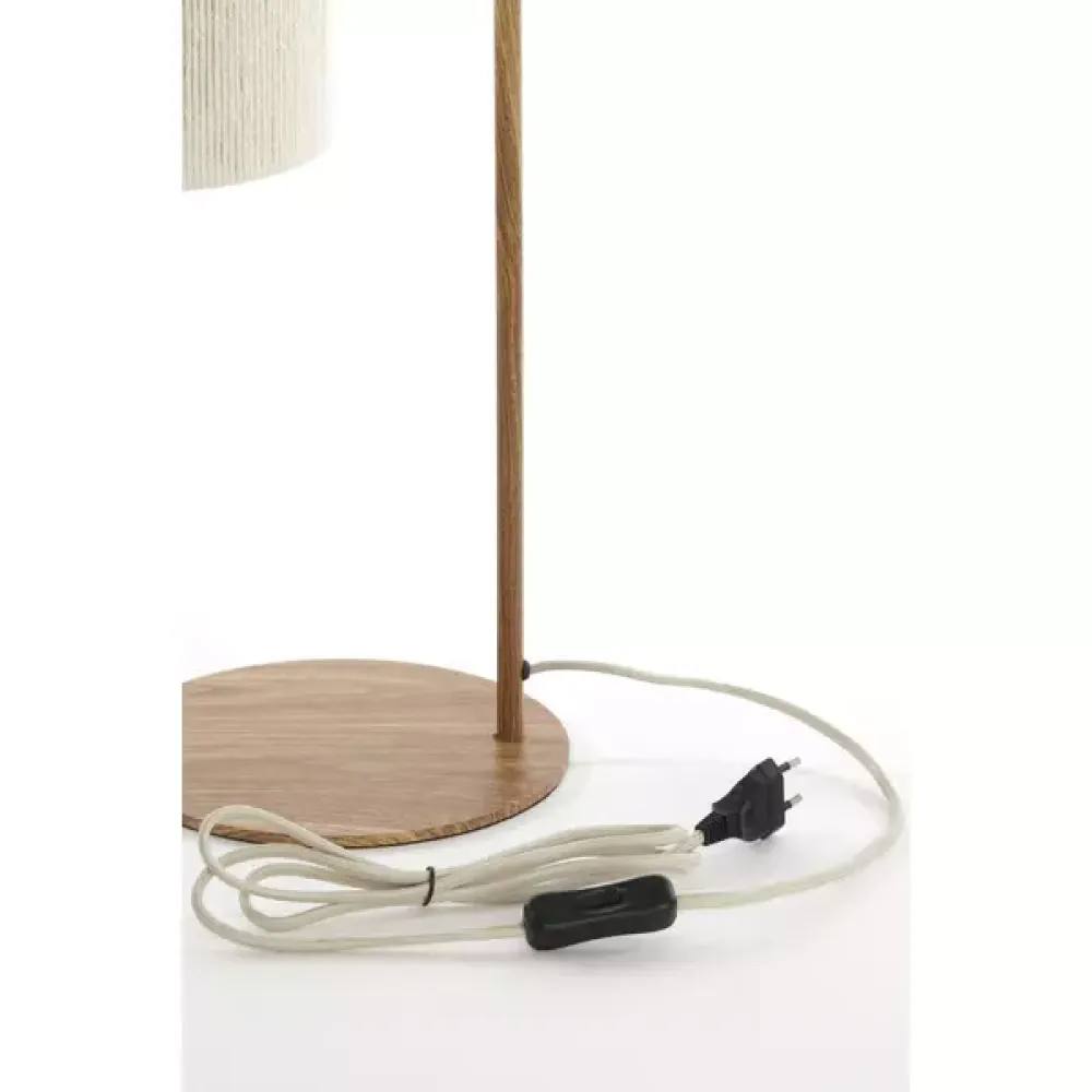 Deze mooie tafellamp is een prachtig voorbeeld van hoe natuurlijke elementen en modern design samen kunnen komen. Met een hout print en crème touwdetails