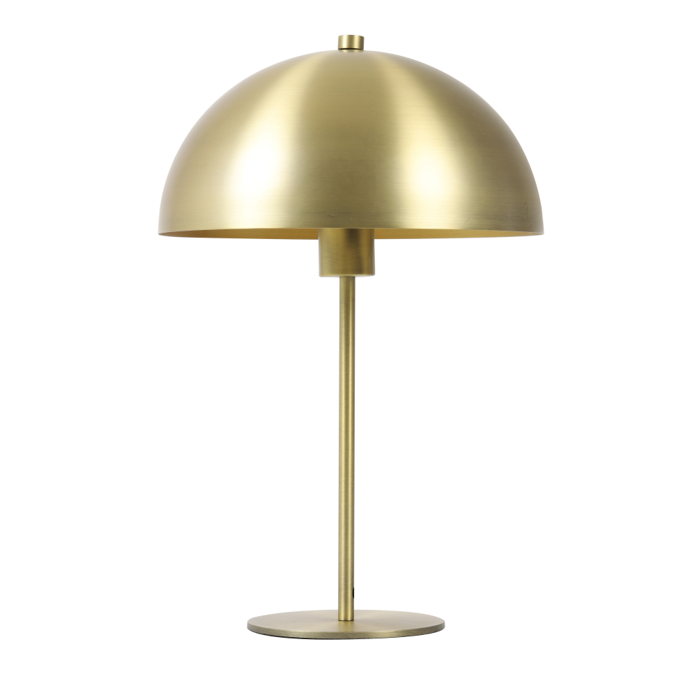 Deze gouden tafellamp met halfronde kap brengt de retro stijl helemaal terug! Deze moderne tafellamp heeft strakke ronde vormen en is makkelijk te plaatsen in ieder interieur. Dankzij de ronde metalen lampenkap creëer je gericht licht naar beneden. Handig als nachtlampje of leuk te gebruiken als verlichting op een sidetable of bijzettafeltje. De kap heeft de vorm van een champignon en is gemaakt van metaal met een matte afwerking. De poot heeft een slank design en een dunne ronde metalen voet. De afmeting van dit product is Ø29,5 x 45 cm.Combineer verschillende lampen voor een speelse look!