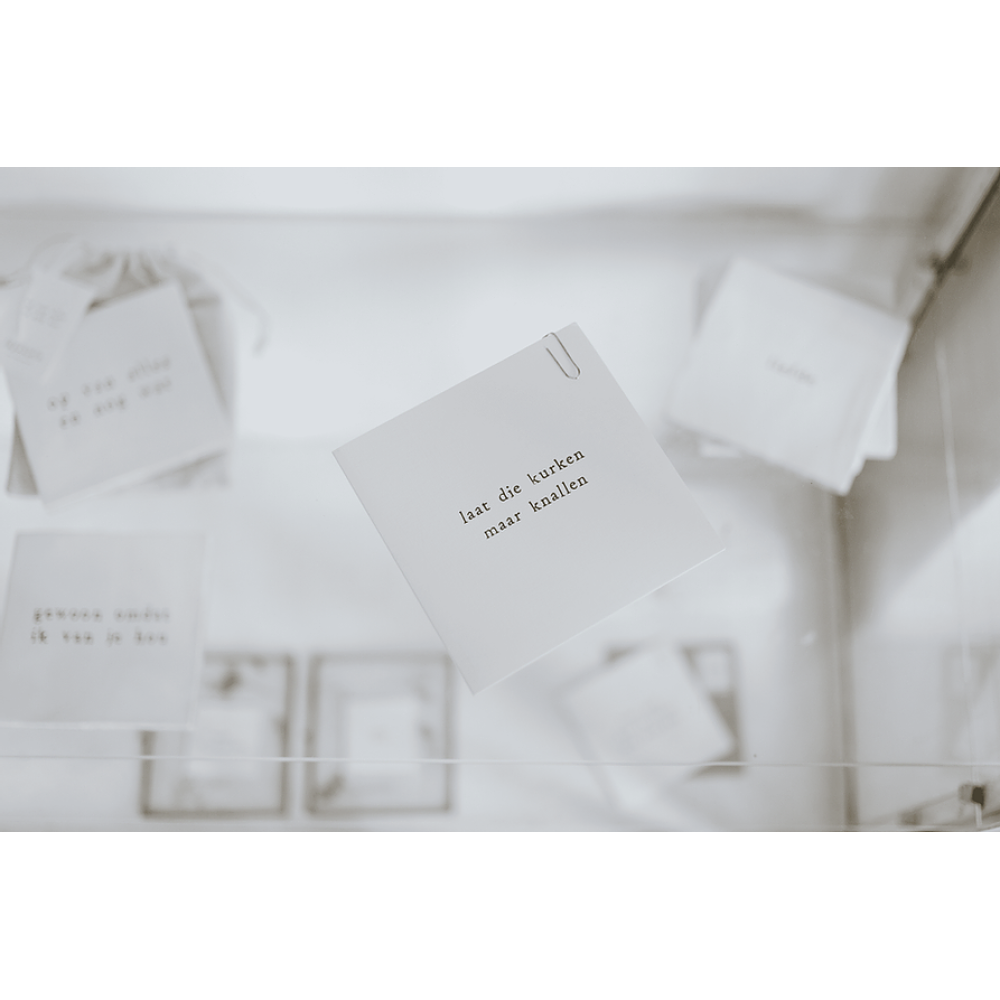De kaarten van Ik pak je in zijn met liefde gemaakt en van linnenpers-papier met het FCS-keurmerk. Ze zijn bedrukt met biologische inkten en er zit een kraftpapier envelop bij met goudkleurig paperclipje.