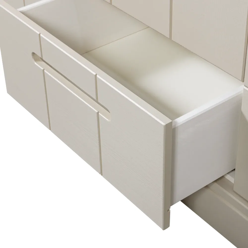 De WOOOD Connect 3-deurs kledingkast + lade in Dust combineert stoer design met praktische opbergruimte. De kast is vervaardigd van massief hout met een strakke, matte afwerking in zachte Dust-tint, wat een rustige en moderne uitstraling geeft.