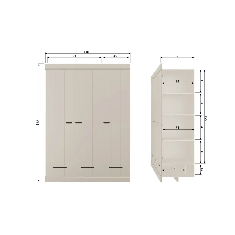 Met drie deuren en een extra lade biedt de Connect kast volop ruimte voor kleding, beddengoed en accessoires. Het tijdloze ontwerp past moeiteloos in diverse interieurstijlen, van Scandinavisch tot industrieel, en zorgt voor een overzichtelijke en stijlvolle slaapkamer.