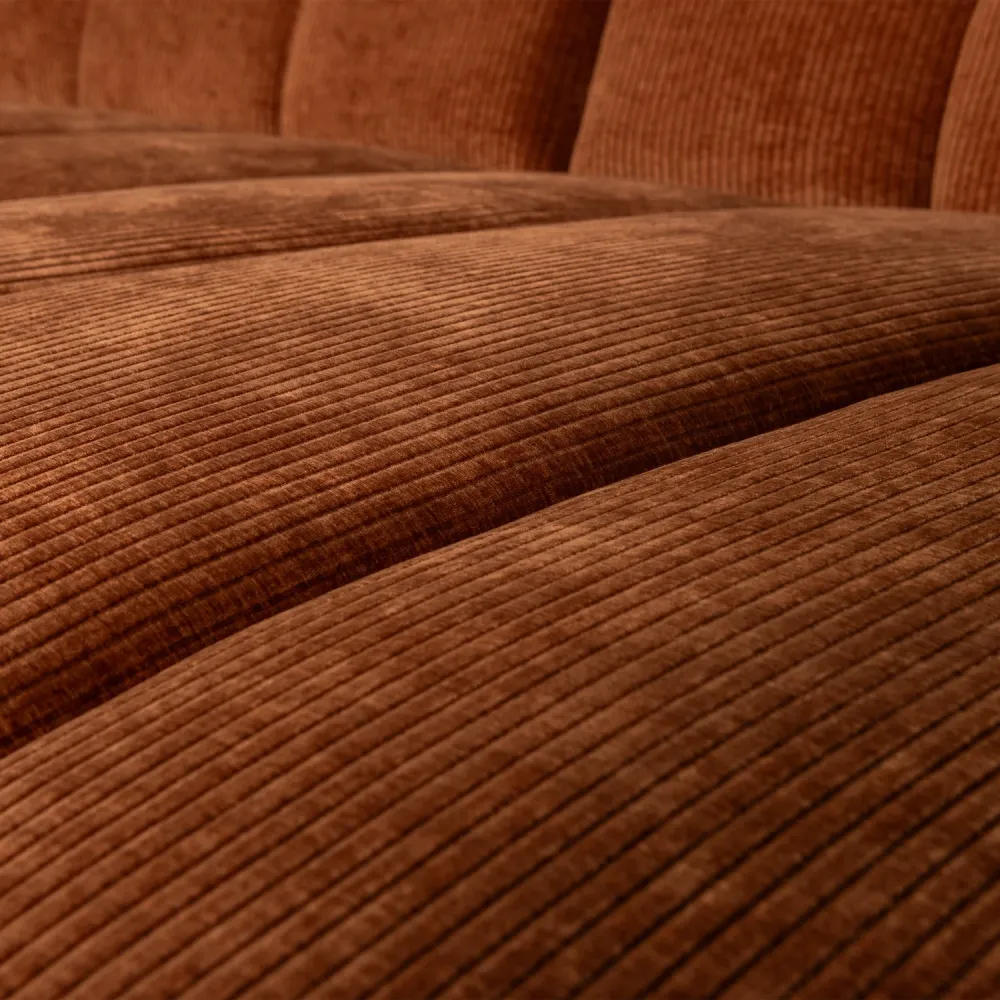 De Mojo chaise longue bank rechts in ribstof roestbruin van WOOOD is een echte blikvanger in je woonkamer. Deze moderne loungebank combineert stoer design met optimaal comfort. De royale zitdiepte en zachte ribstof zorgen ervoor dat je heerlijk kunt ontspannen, terwijl de warme roestbruine kleur direct sfeer toevoegt aan je interieur.